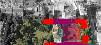 Die roten und rötlichen Flächen bezeichnen die geplanten neuen Nebentrakte und die zentral gelegene Tiefgarage.