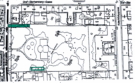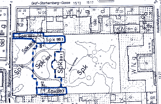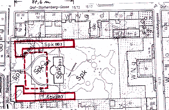 strichlierte färbige Eintragungen stellen Tiefgaragenpläne dar